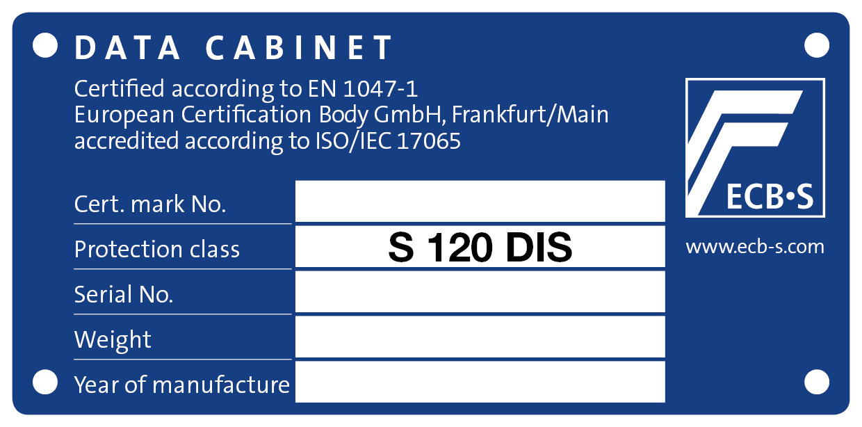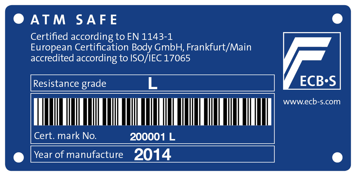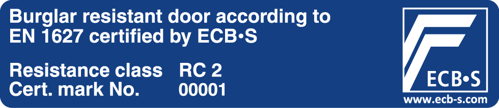 The ECB•S certification mark documents that the security products have been certified by the European Certification Body, meet the requirements of the relevant European Standard (e.g. EN 1143-1, EN 1047-1), have been manufactured under a quality management system (normally certified according to ISO 9001).The certification mark shows the ECB•S serial number by which the manufacturer can be identified.
